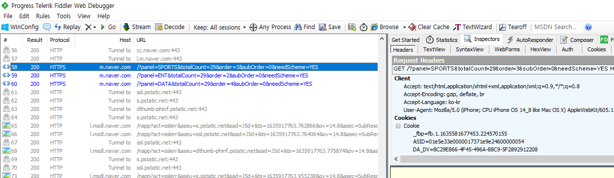 모든 설정을 완료 후 모바일에서 네이버를 접속하였을 때, 피들러에 패킷들이 찍히는걸 확인하실 수 있습니다.