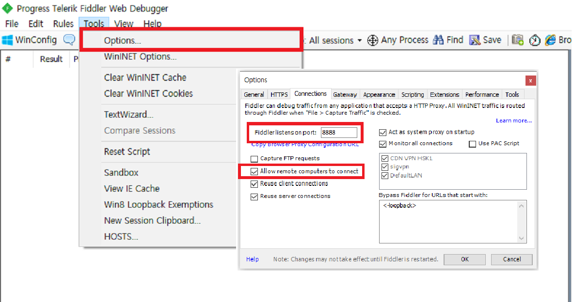 - 프록시 구성 > 서버에는 PC의 IPv4 주소를 적어주고 > 포트에는 피들러에 설정한 포트 번호 입력