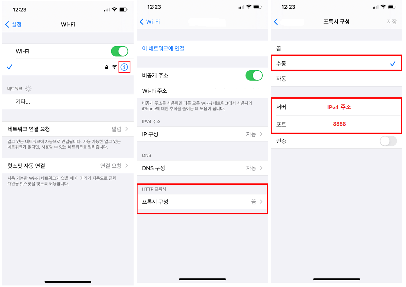 - PC와 모바일 둘 다 같은 Wi-Fi를 연결을 하고, 모바일 Wi-Fi - HTTP 프록시 설정