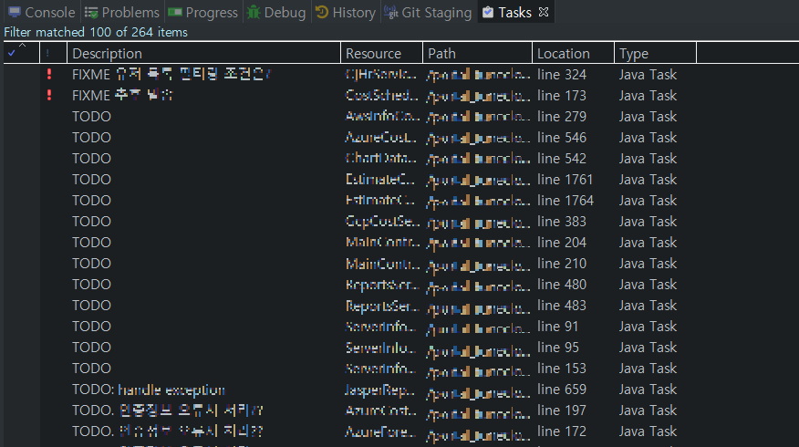 이클립스에서 하단에 Tasks 탭으로 확인할 수 있고 클릭하면 해당 소스코드로 바로 이동도 가능해요.