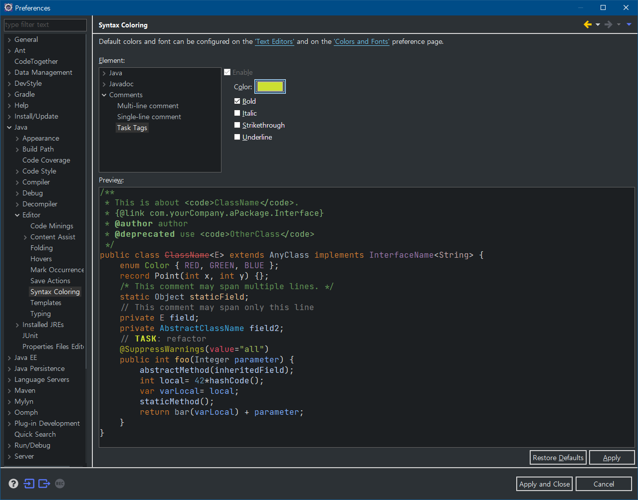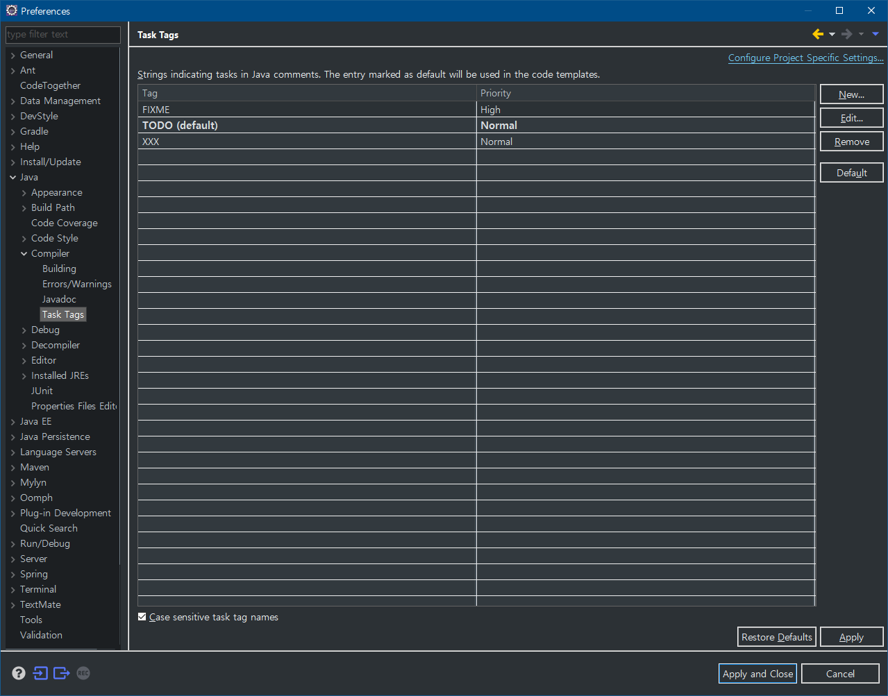 아래 Task Tags 메뉴에서 Task tag를 추가, 수정할 수 있고 우선순위를 설정할 수 있습니다.