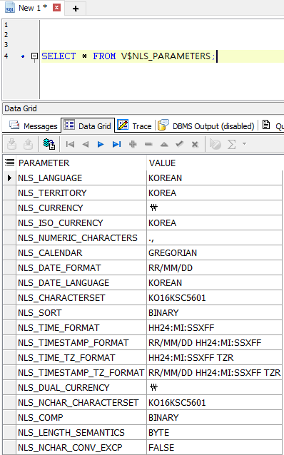 결론 : DB의 LANGUAGE 설정, CHARACTERSET 설정과 PC에 설치한 ORACLE CLIENT의 NLS_LAND 설정값을 맞춰라!!!