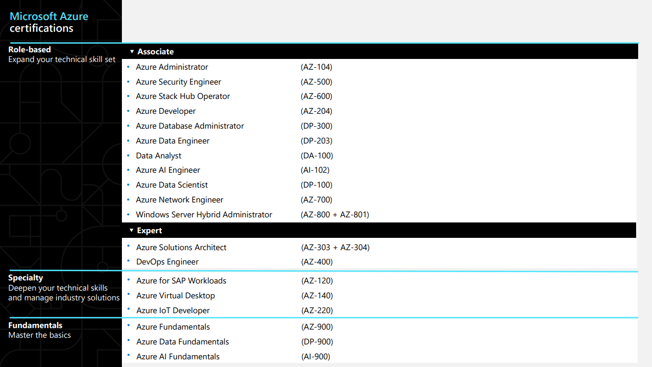 | Microsoft Certified: Azure Solutions Architect Expert | AZ-303, 304 |