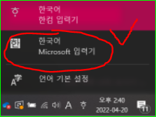 표시된 부분을 클릭 -> 한국어 Microsoft 입력기 클릭 -> 주석기능 정상 작동