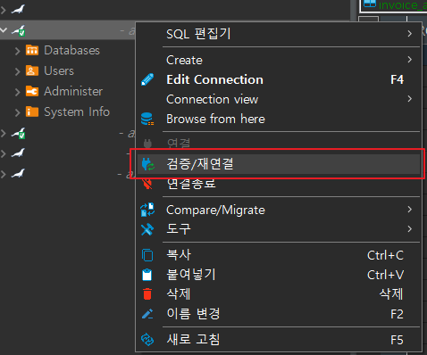 해결 방법: DB 마우스 오른쪽 클릭 > 검증/재연결 또는 DBeaver 재시작