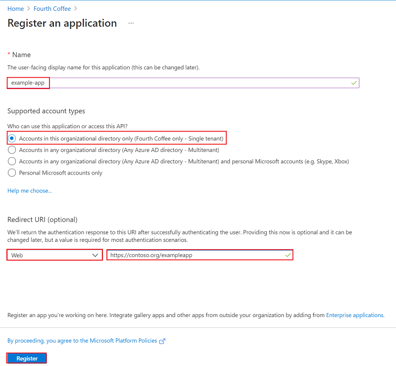 4. 애플리케이션 이름을 지정합니다(예: "example-app"). 애플리케이션을 사용할 수 있는 사람을 결정하는 지원되는 계정 유형을 선택합니다. 리디렉션 URI 아래에서 만들려는 애플리케이션 유형으로 웹을 선택합니다. 액세스 토큰이 전송되는 URI를 입력합니다. 네이티브 애플리케이션에 대한 자격 증명을 만들 수 없습니다. 자동화된 애플리케이션에는 해당 유형을 사용할 수 없습니다. 값을 설정한 후 등록을 선택합니다.