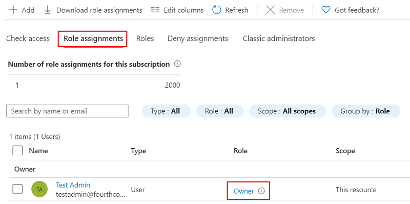 4. Role assignments을 선택하여 할당된 역할을 보고 AD 앱에 역할을 할당할 수 있는 적절한 권한이 있는지 확인합니다. 그렇지 않은 경우 구독 관리자에게 사용자 액세스 관리자 역할에 사용자를 추가하도록 요청하십시오. 다음 이미지에서는 사용자에게 Owner 역할이 할당되어 있습니다. 이는 사용자에게 적절한 권한이 있음을 의미합니다.