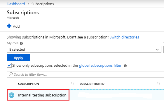 ※ 찾고 있는 구독이 표시되지 않으면 글로벌 구독 필터를 선택하십시오. 포털에 대해 원하는 구독이 선택되었는지 확인합니다.