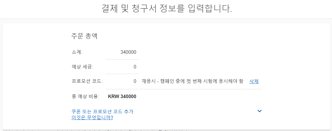 프로모션 코드 PEARSONKR를 입력하시면, 추후 재응시가 필요한 경우 무료 재응시가 가능합니다.