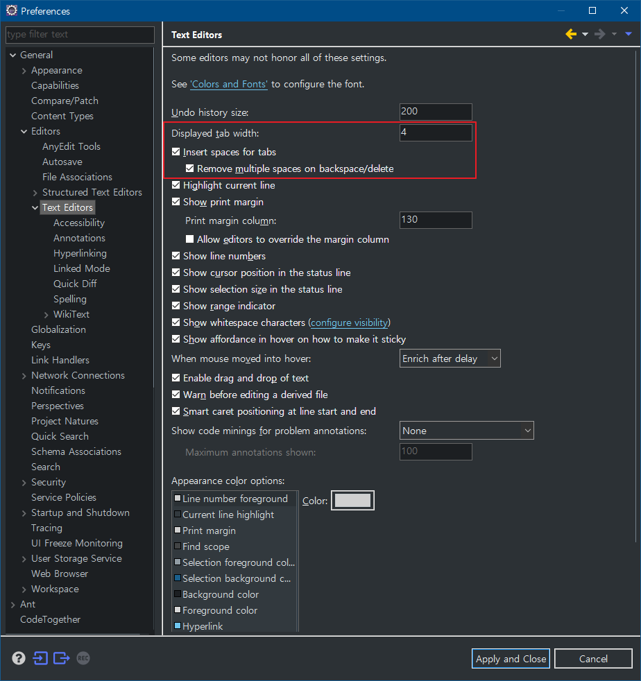 이클립스에서 탭을 스페이스로 변경하여 사용하는 걸 알아보자.