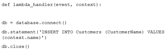 A Developer has implemented a Lambda function that needs to add new customers to an RDS database that is expected to run hundreds of times per hour. The Lambda function is configured to use 512MB of RAM and is based on the following pseudo code: